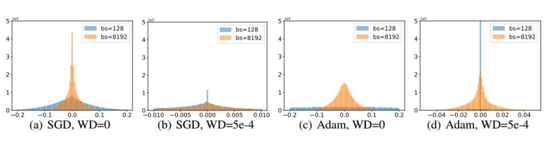 图 3:权重的直方图。权重衰变率为 0、批尺寸较小的时候得到的权重较大。权重衰变率不为 0、批尺寸较大的时候得到的权重较小。
