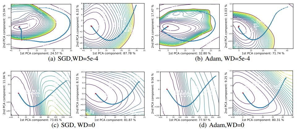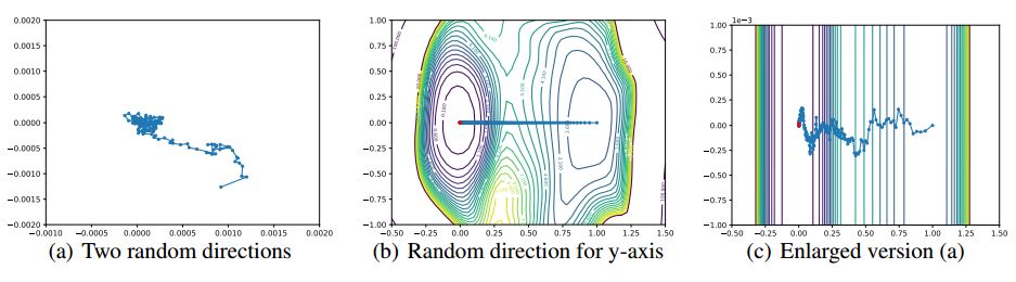 图 8:优化器轨迹的无效可视化。这些可视化方法遭遇了高维空间的随机方向正交性带来的困难。