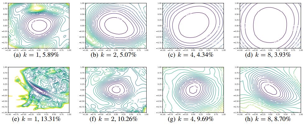 图 7:Wide-ResNet-56(WRN-56)包含捷径连接(上半 4 张)和不包含捷径连接(下半 4 张)在 CIFAR-10 上的损失函数图像。k=2 表示每层有两倍的滤波器,k=4 表示每层有四倍的滤波器,等。测试误差在每个图下方标出。