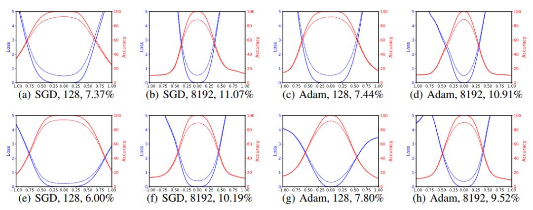 图 2:通过对 VGG-9 使用小批次和大批次方法得到的解的 1D 线性差值。蓝线是损失值,红线是准确率。实线是训练曲线,虚线是测试曲线。小批次在横坐标的 0,大批次在横坐标的 1。