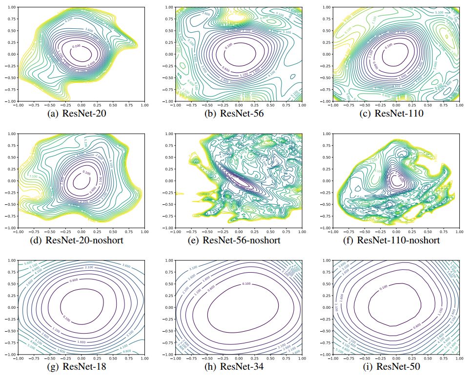 神经网络的训练依赖于寻找高度非凸损失函数的(足够好的)极小值的能力。利用特定的网络架构设计(例如,跳过连接)生成的损失函数可以使训练过程变得更简单,利用精心调整的训练参数(批尺寸、学习率、优化器)可以达到使泛化能力更好的极小值。然而,对于这些规律,以及这些因素对损失函数形态的影响,并没有得到很好的理解。在这篇论文中,我们用多种可视化方法探索了神经网络损失函数结构,以及损失函数的形态对泛化能力的影响。首先,我们介绍了一种简单的「过滤器归一化」(filter normalization)方法帮助我们可视化损失函数的曲率,并对损失函数进行有意义的并排对比。然后我们使用多种可视化方法探索了网络架构对损失函数形态的影响,以及训练参数对极小值的形态的影响。