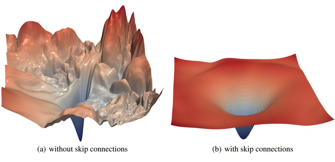 研究表明,当神经网络很深或没有跳过连接的时候,损失函数的曲面会从凸面的、平滑的转变成杂乱的、尖锐的,进而大大降低泛化能力和可训练性。