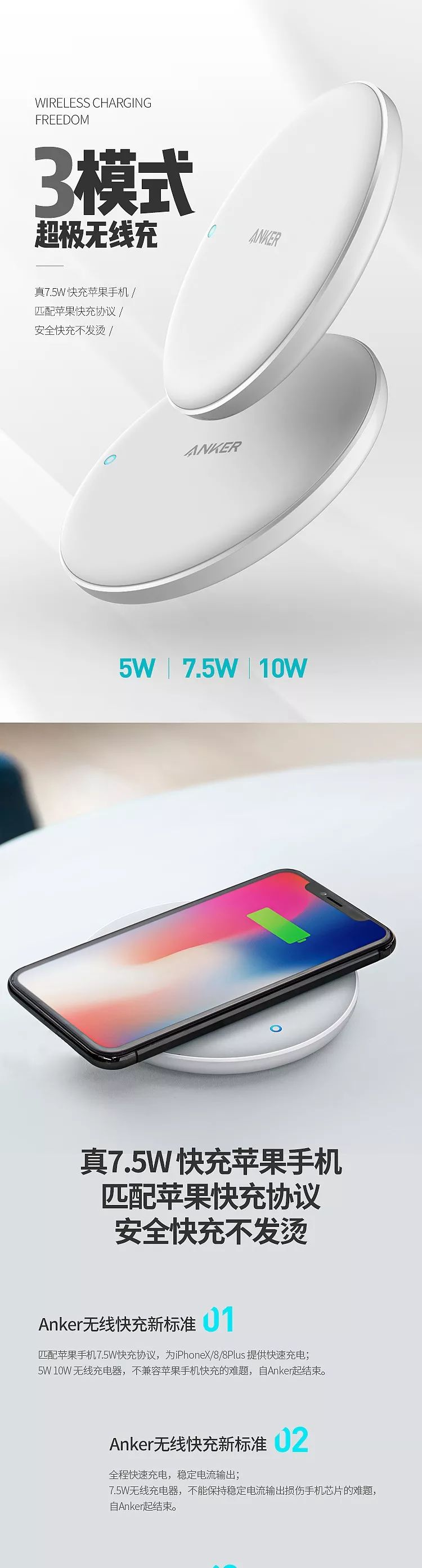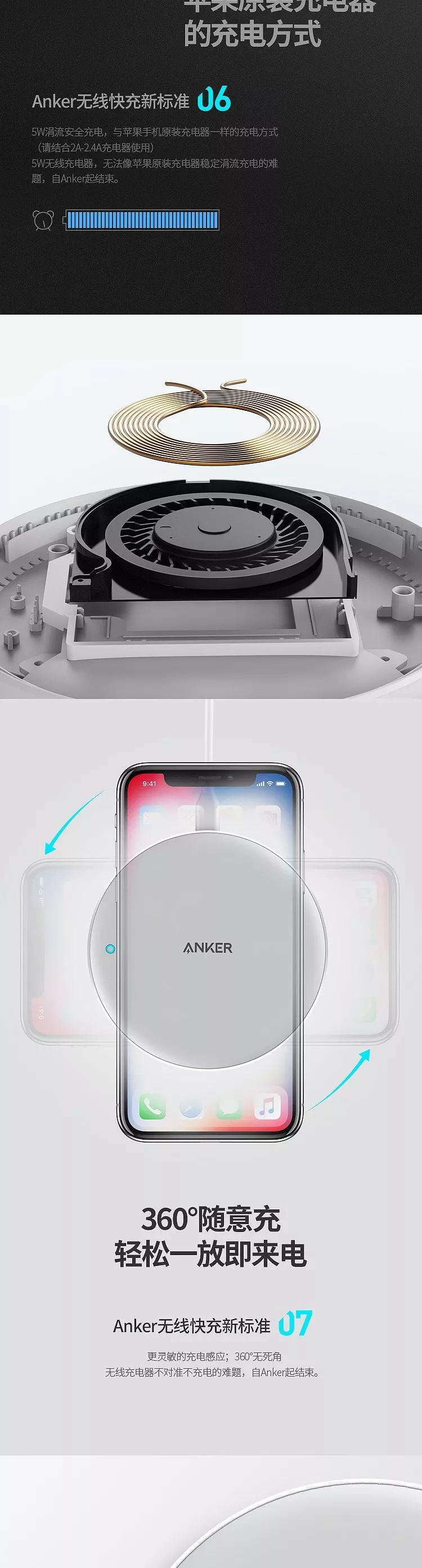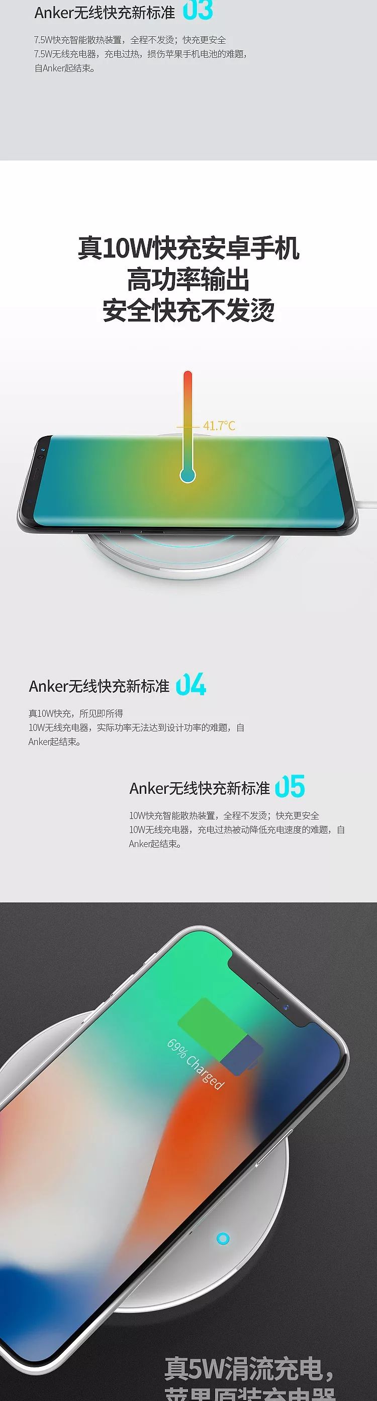2. 高效率充电:效率是无线充电的关键参数,效率越高意味着同样时间,冲进手机的电量越多,即使提高1个百分点也会很显著。我们这款产品使用高效率元器件,相比通常7.5W产品60~65%的效率,Anker这款产品达到了73%。
