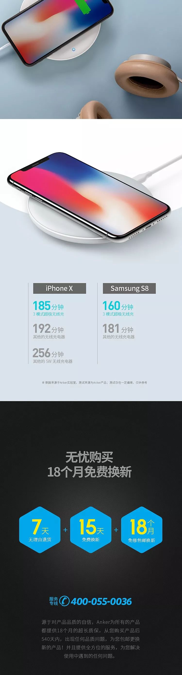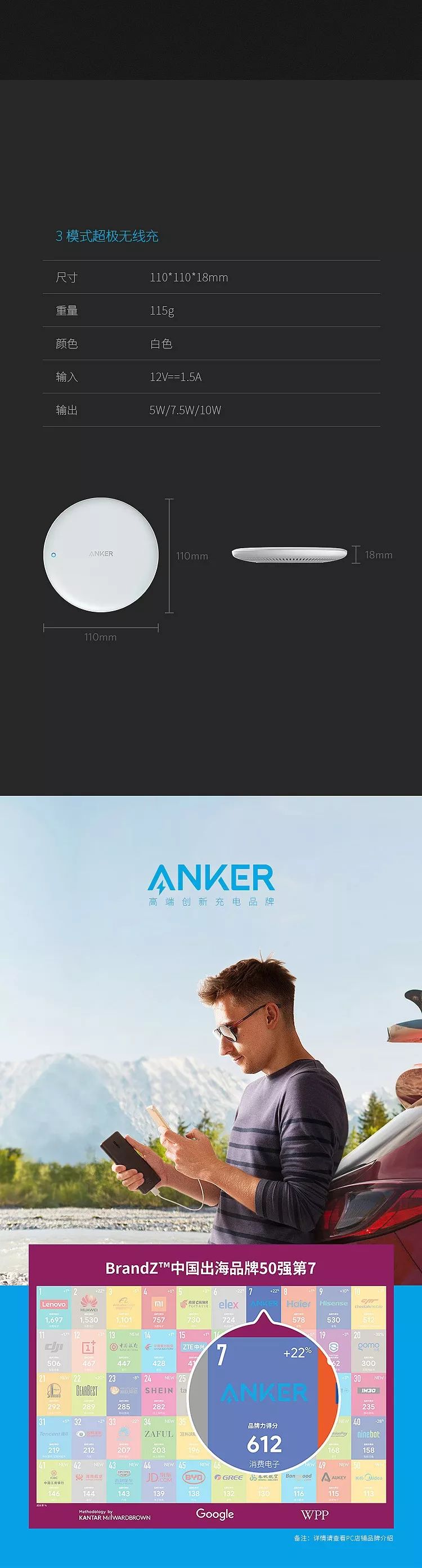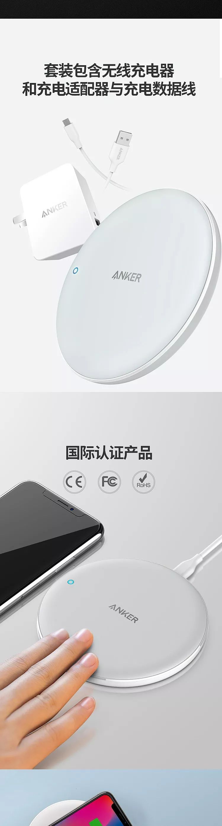 2. 高效率充电:效率是无线充电的关键参数,效率越高意味着同样时间,冲进手机的电量越多,即使提高1个百分点也会很显著。我们这款产品使用高效率元器件,相比通常7.5W产品60~65%的效率,Anker这款产品达到了73%。