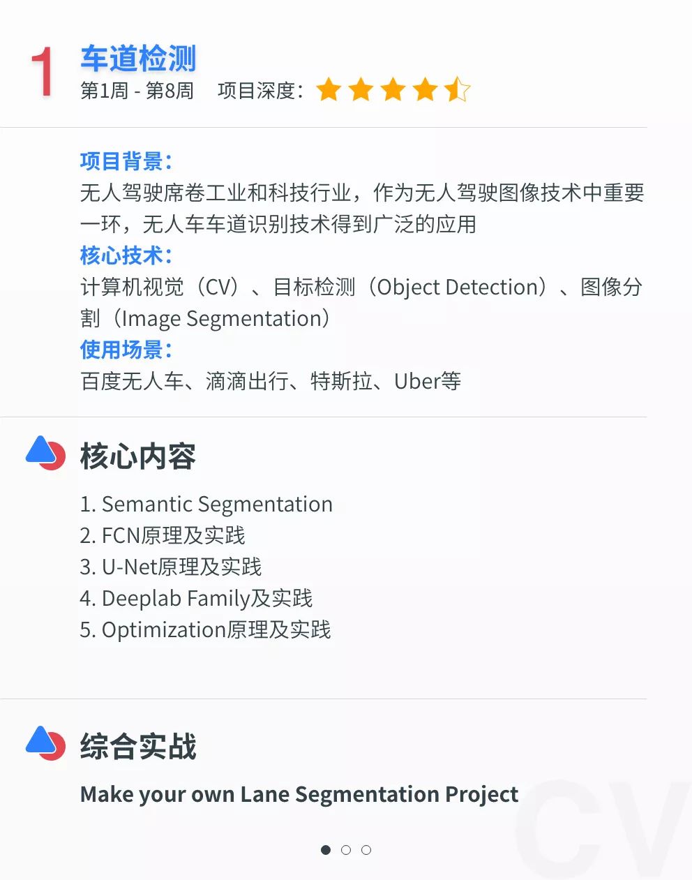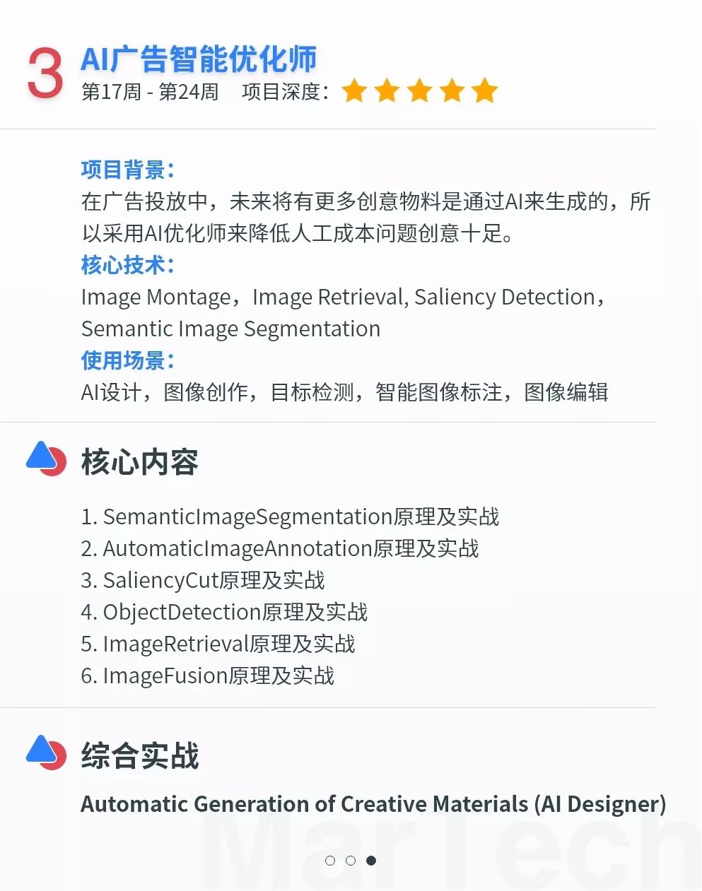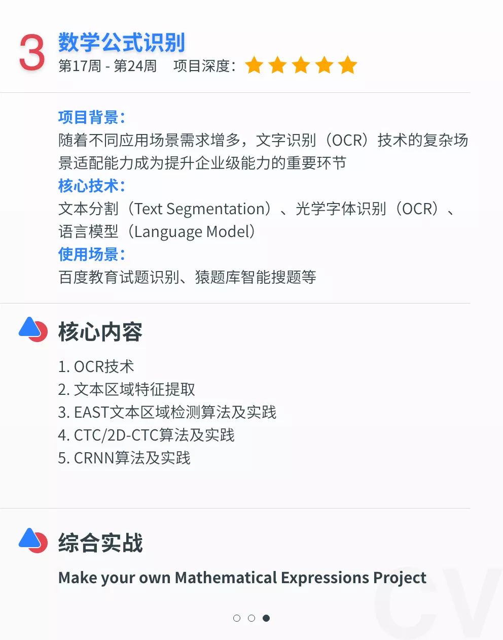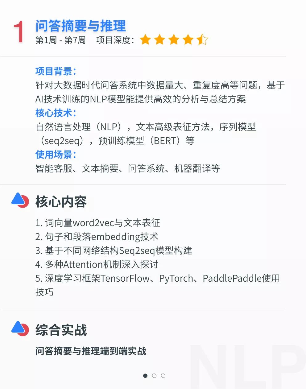 百度精选NLP/CV/计算广告3大方向9大AI前沿工程项目,并提供企业真实应用的脱敏数据集供学员实战使用,旨在培养具有核心竞争力的AI工程师。