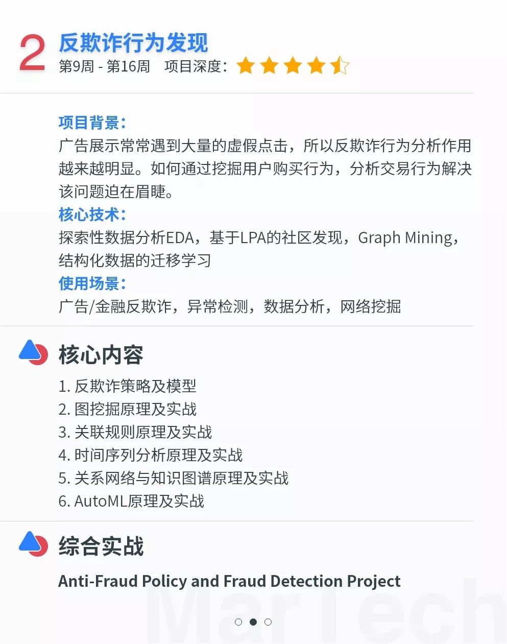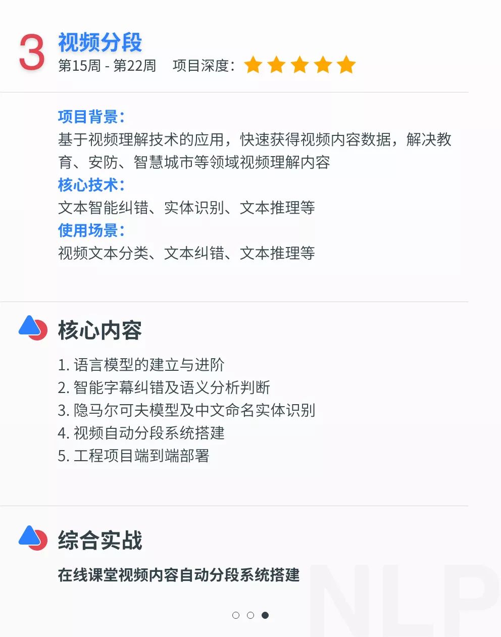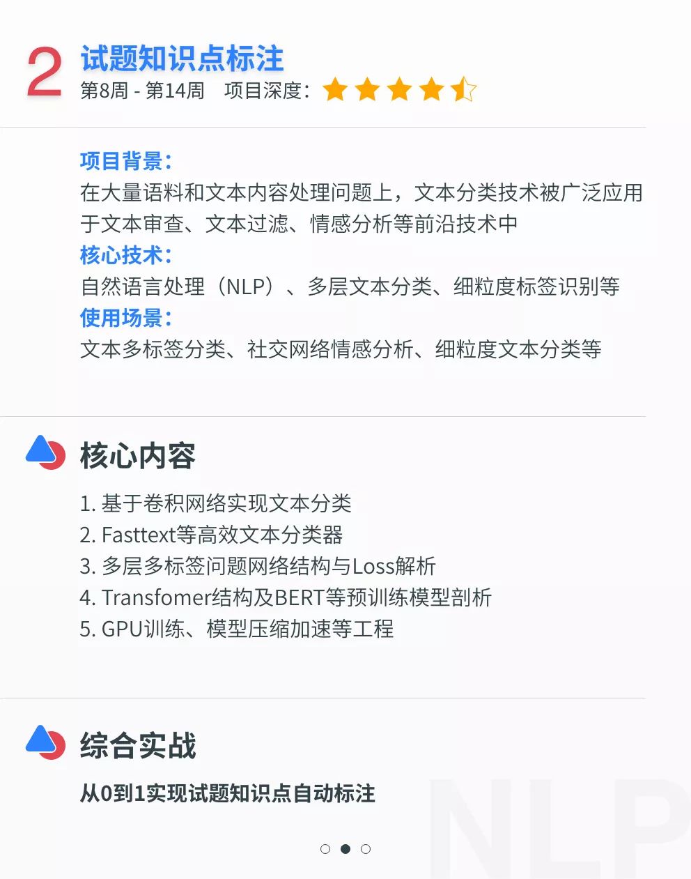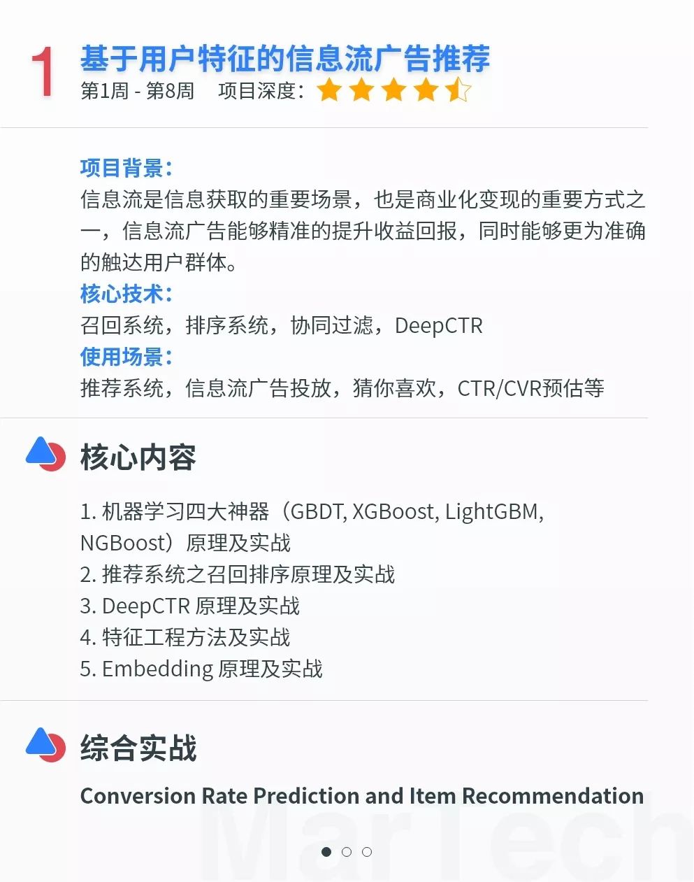 百度精选NLP/CV/计算广告3大方向9大AI前沿工程项目,并提供企业真实应用的脱敏数据集供学员实战使用,旨在培养具有核心竞争力的AI工程师。