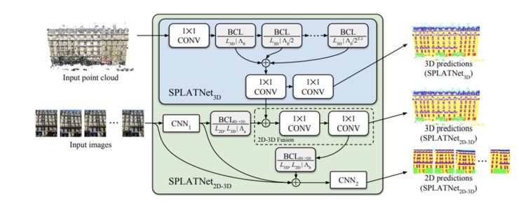 另一方面,一些研究已经绕开了点云分割/点云分割++中提出的经典特征提取方法,而选择设计一种综合处理点云的新方法。Su 等人提出的 SPLATNet(2018,https://arxiv.org/pdf/1802.08275.pdf)架构,是点云研究新焦点中一个极好的例子——作者设计了一种新的结构和卷积算子,可以直接在点云上操作。这篇论文的主要观点是,将「感受野」的概念转译为能让空间信息即使在稀疏区域(点云分割/点云分割++的一个主要缺陷)也能够被保存的不规则点云。特别有意思的是,SPLATNet 可以将从多视图图像中提取的特征投影到 3D 空间中,在端到端可学习结构中融合 2D 数据与原始点云。使用这种 2D- 3D 联合学习,SPLATNet 在语义分割中实现了最优性能。