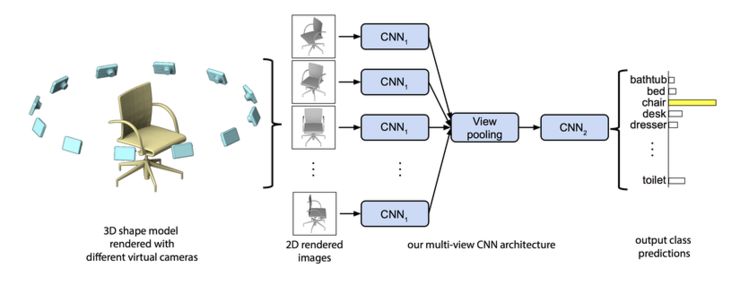 使用 3D 数据的多视图表示,是 2D 深度学习技术适配于 3D 的最简单方法。将 3D 感知问题转换为 2D 感知问题是一个聪明的做法,但在某种程度上,这种方法仍然需要你推理出一个目标的 3D 几何。早期基于深度学习的工作使用了这一方法的是 SU 等人的论文 Multi-view CNN(2015,https://arxiv.org/pdf/1505.00880.pdf),它提出的 Multi-view CNN 这个简单而有效的结构,能从一个 3D 目标的多个 2D 视图中学习特征描述符。比起使用单个 2D 图像来进行目标分类,采用了这一方法的结构具有更好的性能。它的实现方式是:将单个图像喂给在 ImageNet 上进行了预训练的 VGG 网络从而来提取显著特征、池化产生的激活图,并将这些信息传送到附加卷积层来进一步进行特征学习。