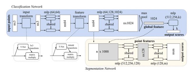 整个点云分割结构集成了原始方法、T-Net 与为点云创建特性表示的多个 MLP 层。然而,除了目标分类之外,点云分割还能够实现目标和场景的语义分割。为了实现这一点,点云分割结构将最大池化对称函数中的全局特征向量与在输入数据被传送到一些 MLP 之后学习的任一点的特征相结合。通过连接这两个向量,每个点都能感知到其全局语义和局部特征,从而使网络能够学习有助于分割的附加的、更有意义的特征。