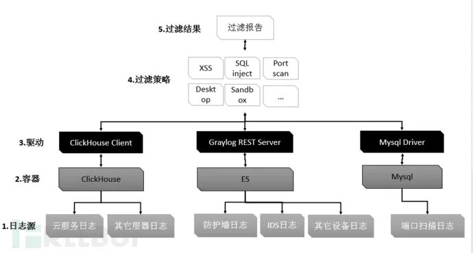 从”1.日志源“开始,到实际存数据的“2.容器”,就是基础数据持久层,然后我们通过实现一个“3.驱动”层来提供数据读取的可能。最后我们会把”4.过滤策略”应用到我们的数据上,通过编写算法策略来实现数据过滤和甄别,最后我们能得到什么数据呢?我们可以通过白名单和黑名单得到更准备的报警消息。 我们可以得有关行为的关联数据。我们可以建立一个数据反馈机制,沉淀威胁数据和安全策略。我们可能针对不同报警,做再次判断处理, 降低误报噪音,加强正确报警的识别度。