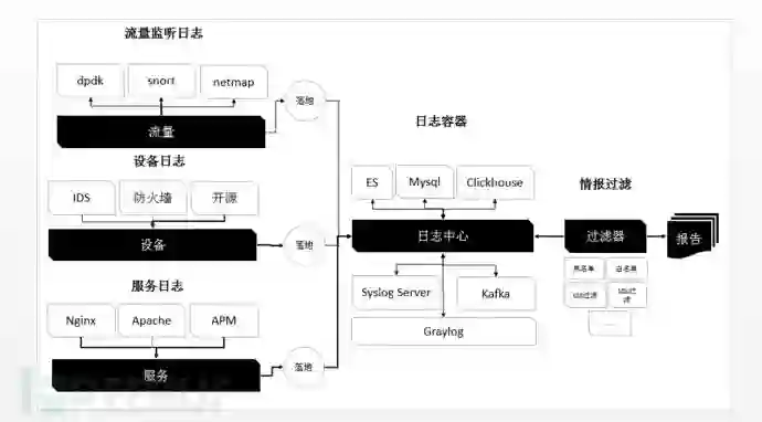 现在各个公司都有自己的SOC安全日志中心,有的是自己搭建的,有的是买厂商的,更多的情况是,各种复合类的的组织结构。这些日志来自不同的服务器,不同的部门五花八门。如果是买的设备,设备可能是一整套的方案,有自己的流理量监听与安全日志中心,但因为成本的原因,不能所有地方都都部署商业产品,必然会有自己的SOC系统,商业系统也不可能去监听分析,太边界的日志,处理起来也力不从心,首先本地化的数据不通用,商用产品也没法构建安全策略。开源和自己构建的系统可以高度的定制化,但与商业产品不能有机的结合,就没办法发挥最大效用。