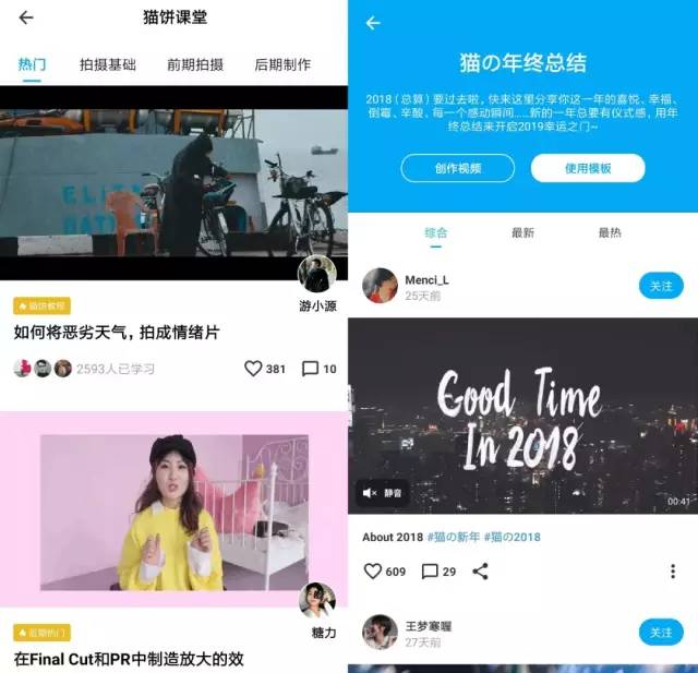 以猫饼app为例,产品主打的“猫饼课堂”栏目涵盖了拍摄基础、前期拍摄、后期制作等,能够以简明的方式帮助普通人完成入门和进阶。