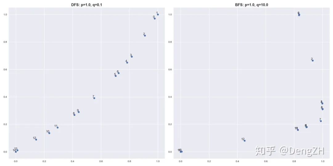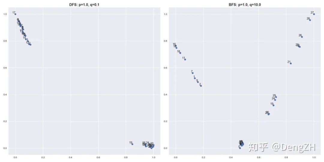 不妨在想象中检查一下,如果 P(访问其他一阶邻居结点) > P(返回前序结点)=P(访问共同邻居),那么随机游走就有可能一路推进不同的结点,构成一条重复结点较少的路径,确实符合 DFS 的理念。而如果 P(访问其他一阶邻居结点) < P(返回前序结点)=P(访问共同邻居),那么随机游走就有可能在一个较小的连接密集的局部中来会跳,构成一条重复结点较多的路径,这符合 BFS 的理念。