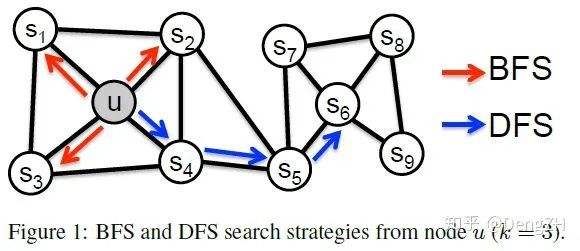 前面通过 Figure 3 来重新认识了同质性和结构性。但为什么 DFS 会擅长同质性,BFS 会擅长结构性呢?这就得再回顾一下 Figure 2,了解一下 DFS 和 BFS 到底做了什么: