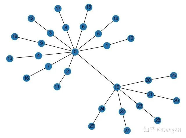 这个网络包含两朵分别以结点 0 和结点 19 为中心的花。将 node2vec 学到的结点 embedding 画出来: