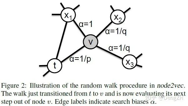 图中展示的是一次随机游走的中间过程,当前处于结点 v 上,上一步是从结点 t 到结点 v。