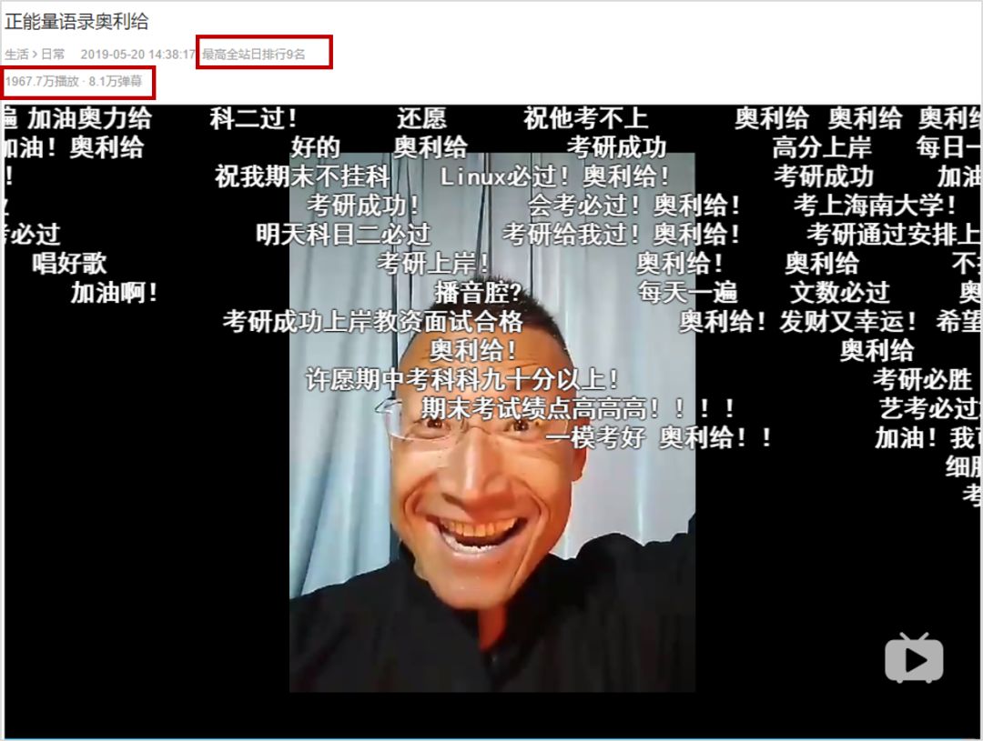 后来才知道原来“奥利给”爆火是因为 B 站上一段名为“正能量语录奥利给”的视频。