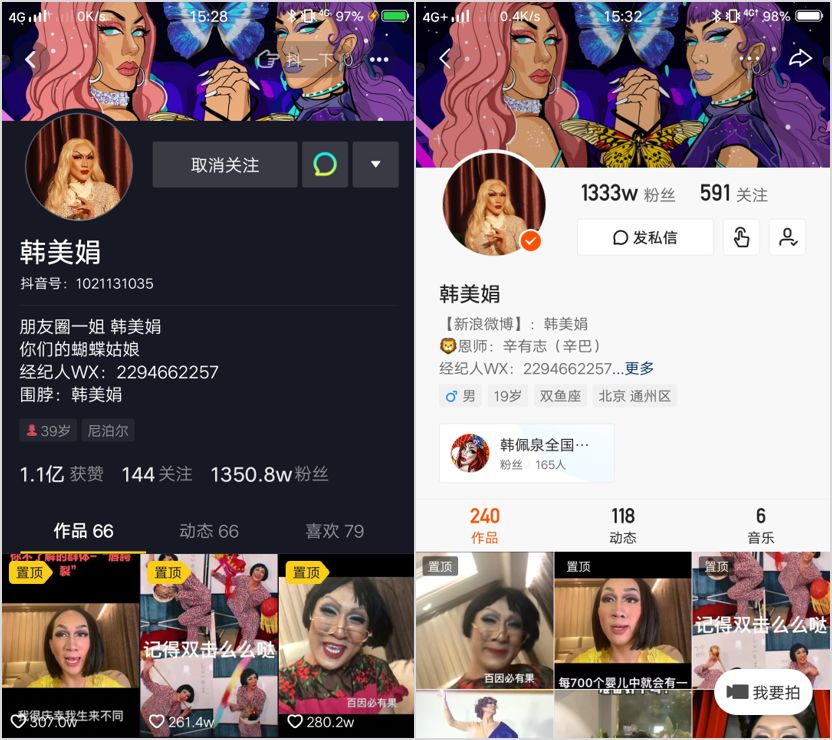 目前他在抖音和快手上的粉丝都破了一千万,在B站上也能看到他的身影。许多网友还发起了#模仿韩美娟#的活动,就连明星乔欣也模仿过他。