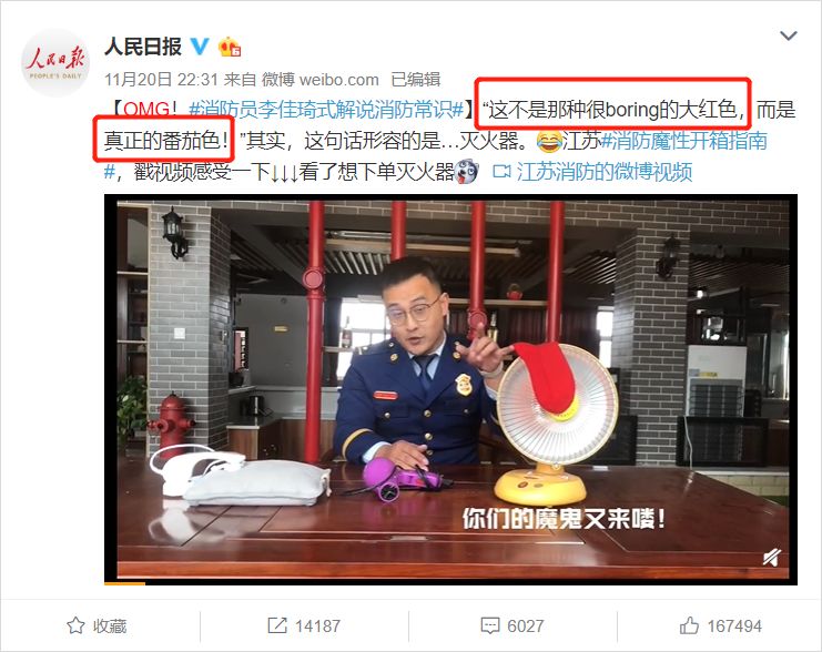 有意思的是,消防员模仿李佳琦做消防相关知识的宣传,指着灭火器说: