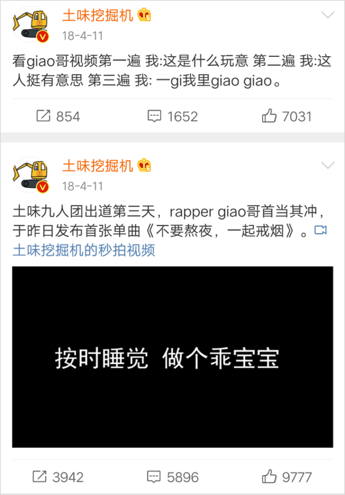 giao 哥走红很大程度要感谢微博上一些专注于土味文化的营销号的大力推荐,例如土味挖掘机和土味老爹,这两个微博都有着数百万的粉丝,对于 giao 哥的宣传可以说功不可没。目前 giao 哥自己在微博上也有了近130万粉丝。