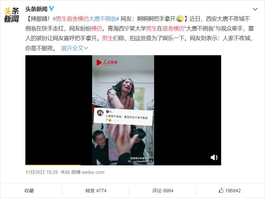 不倒翁小姐姐火了以后,很多人都在模仿,比如某大学男生在宿舍模仿“不倒翁小姐姐”还登上了微博热搜。网友直呼:太辣眼睛,把手拿开。