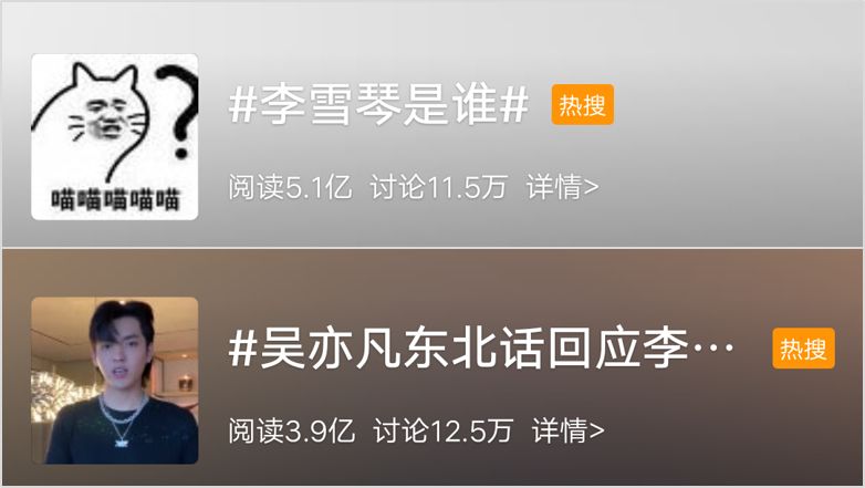 一时间 #李雪琴是谁# 和#吴亦凡东北话回应李雪琴#两个话题迅速蹿上了微博热搜,通过自我介绍就召唤出了爱豆,称得上是“追星锦鲤”了。