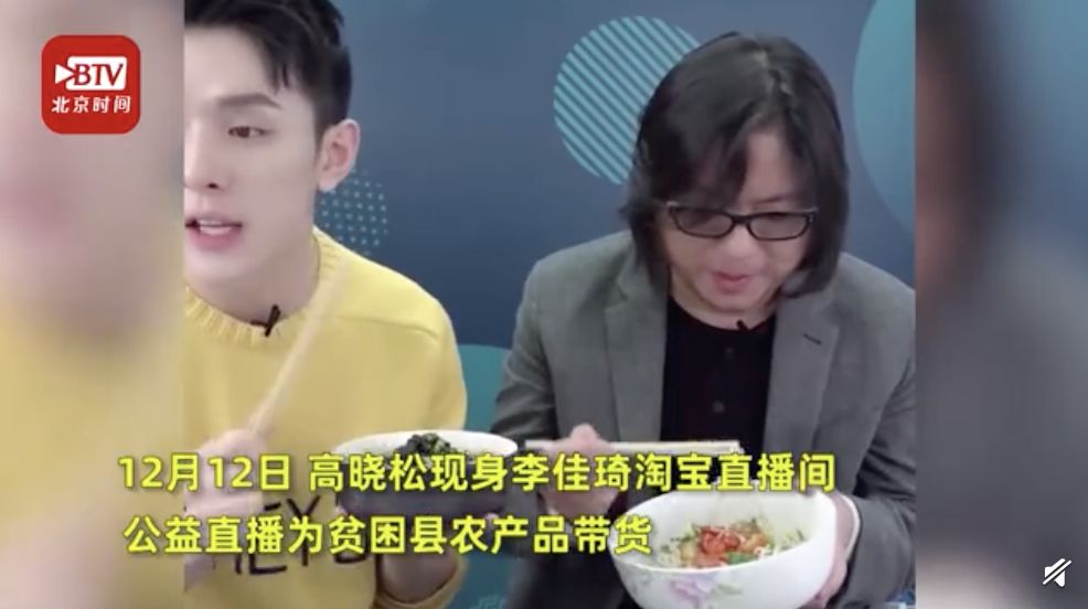 双 12 当天晚上,高晓松走进李佳琦的直播间做公益直播,为贫困县农产品带货。