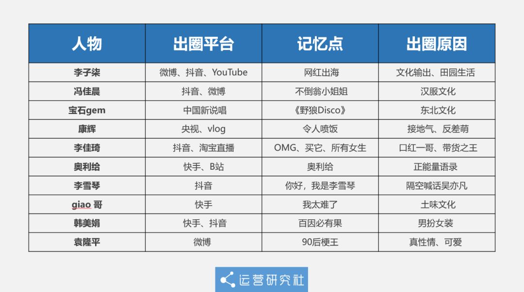随着直播和短视频平台的发展,越来越多的普通人有了红的机会,例如引起文化输出争议的@李子柒,“口红一哥”@李佳琦、不倒翁小姐姐冯佳晨,下班路上开心蹦跶的农民工@杨才明……
