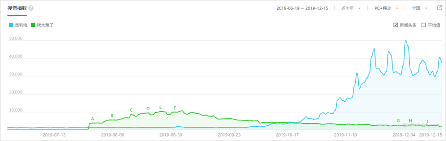 百度指数对比:蓝色为奥利给,绿色为“我太难了”