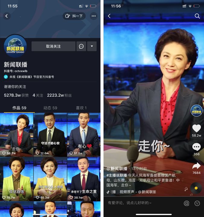 今年 8 月,央视开通了抖音,《新闻联播》官方账号入驻抖音。