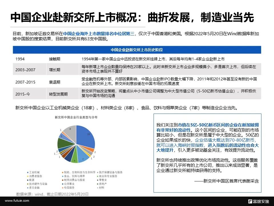 中国企业对新交所并不陌生。目前,中国企业境外上市数量上,新交所排名第三,仅次于中国香港和美国。根据2022年5月20日在Wind数据库新加坡中国股的搜索结果,目前新交所共有63支中国股。