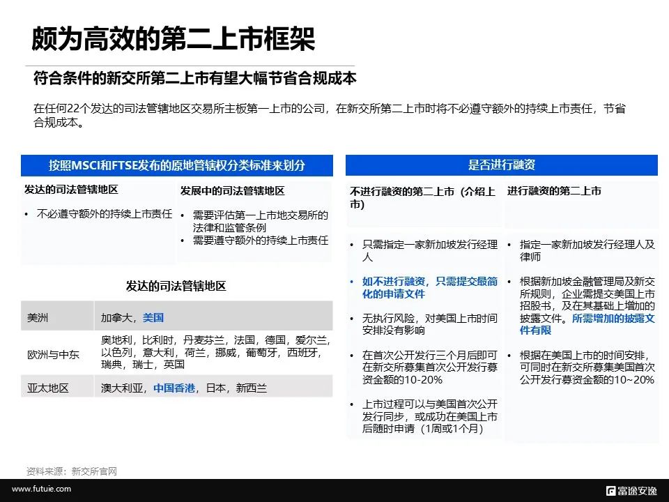 据新交所规则,“在包含美国、加拿大、中国香港等在内的任何22个发达的司法管辖地区交易所主板第一上市的公司,在新交所第二上市时将不必遵守额外的持续上市责任”,且“如不进行融资,只需提交最简化的申请文件”。