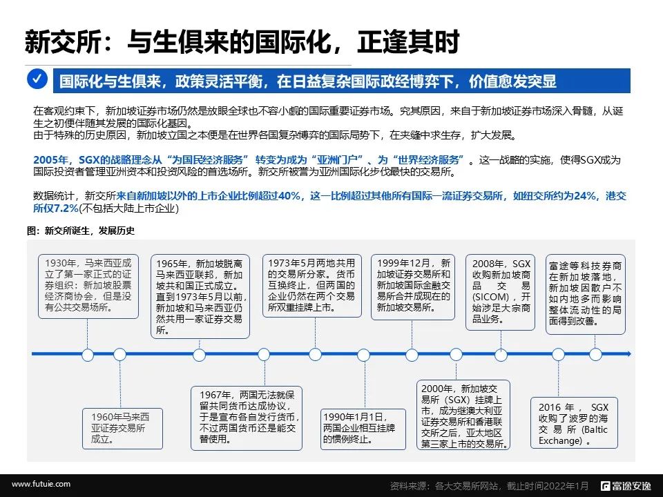 誉为亚洲国际化步伐最快的交易所。2005年,SGX的战略理念从“为国民经济服务” 转变为成为“亚洲门户”“为世界经济服务”。这一战略的实施,使得SGX成为国际投资者管理亚洲资本和投资风险的首选场所。数据统计,新交所来自新加坡以外的上市企业比例超过40%,这一比例超过其他所有国际一流证券交易所,如纽交所约为24%,港交所仅7.2%(不包括大陆上市企业)(数据来源:各大交易所网站,截止时间2022年1月)