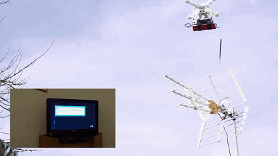 上图显示了黑客利用无人机对智能电视的攻击过程。首先,他用一架配备了无线电软件的大疆无人机靠近电视天线,然后用一个更强大的信号来覆盖合法电视网络信号,从而操纵电视播放黑客想要播放的内容。