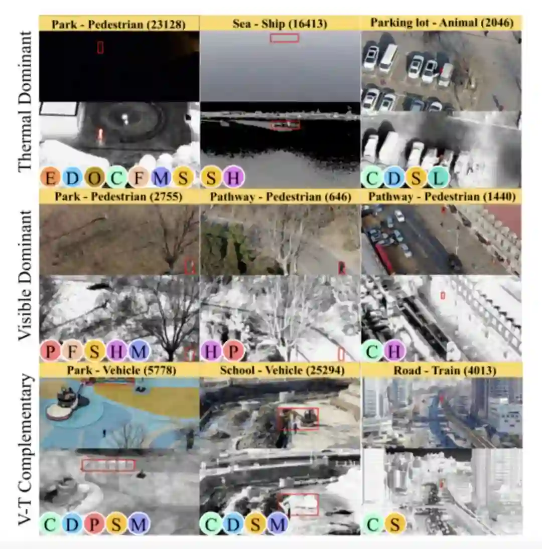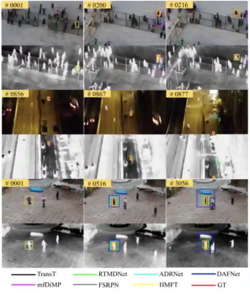 上图展示了摄像机移动、目标形变、极端照明、部分遮挡、完全遮挡、尺度变化、低分辨率等分别在RGB和Thermal模态中出现的图像数据信息不完整的问题,就比如在可视环境差的时候RGB无法有效识别,但是在Thermal可以有效的识别出来。在热聚集的区域,Thermal就会对整个热聚集区域产生响应,但是RGB则不会受此干扰依然保证完整信息。通过RGB与Thermal相互间的信息互补可以达到较为完整的图片信息效果。浪漫主义一点来说就是”相互扶持,相互成就“。