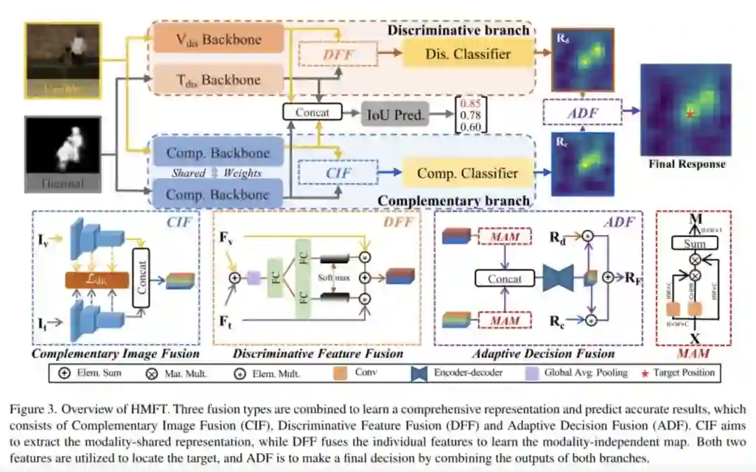 HMFT结构,它包括三个主要模块:互补图像融合(CIF)、判别特征融合(DFF)和自适应决策融合(ADF),其中CIF主要学习两个模态之间的共享信息,DFF主要是对于通道组合进行进行筛选,ADF主要是选择出合适的候选分类目标。