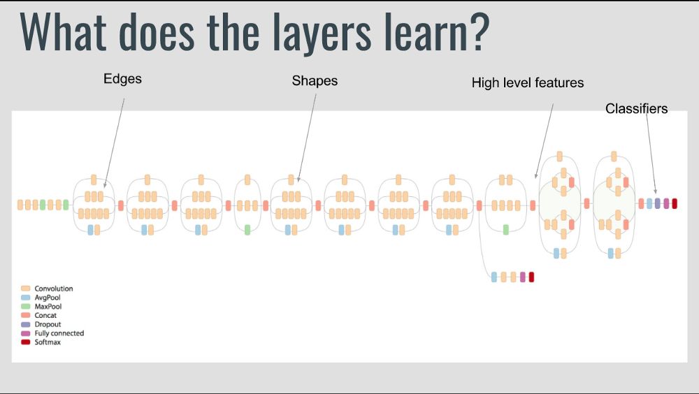 让我们看下深度学习网络学习了什么,靠前的层尝试检测边缘,中间层尝试检测形状,而靠后的层尝试检测高层数据特征。这些训练好的网络通常有助于解决其他计算机视觉问题。