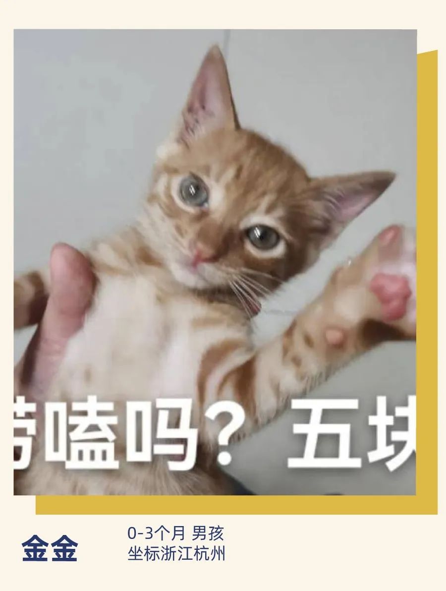救助故事:2个月小橘子弟弟找领养!猫咪叫金金,希望他长大到10斤重的时候就是黄金百两的意思,它还只有一周大的时候被我妈在路边捡到,带回家之后我们用羊奶粉和冻干糊给它奶大了。金金性格活泼,非常调皮,目前已驱虫+即将疫苗,适合有养猫经验者或二胎家庭。期待杭州本地有爱家庭领养。