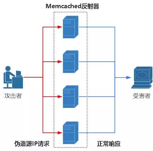 当大量Memcached被同时利用,并用同一个伪造源IP进行回复,就轻而易举地形成了针对这个伪造源(受害者)的大流量DRDoS攻击。