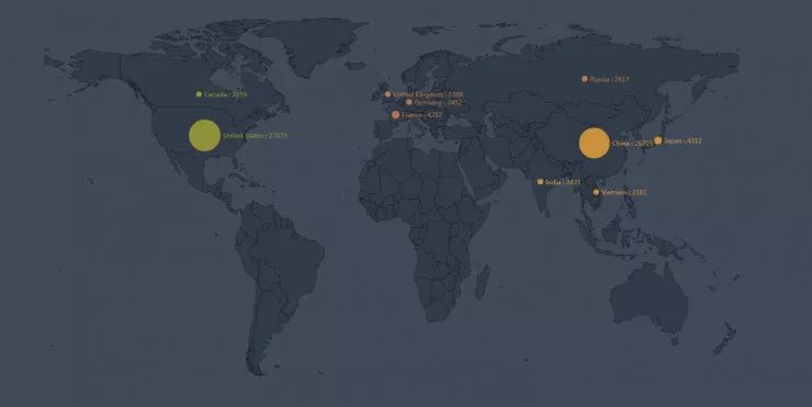 最新统计显示,全球总共有3790个Memcached服务器被利用参与到这些Memcached反射放大攻击。这些被利用反射源遍布于全球96个国家或地区范围内。其中,美国就占了全球的1/4。