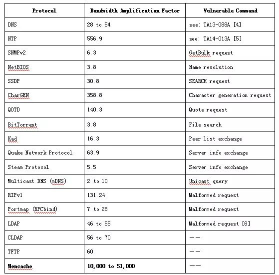 此前各类安全厂商监测到的DRDoS攻击主要是SSDP反射、DNS反射、NTP反射等。下表(引自US-Cert)详细列举了各类反射攻击的放大倍数。