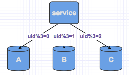 比如目前规划了3个数据库,基于uid进行取余分片,那么每个库上的划分规则如下: