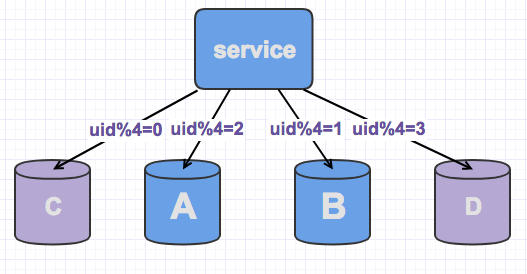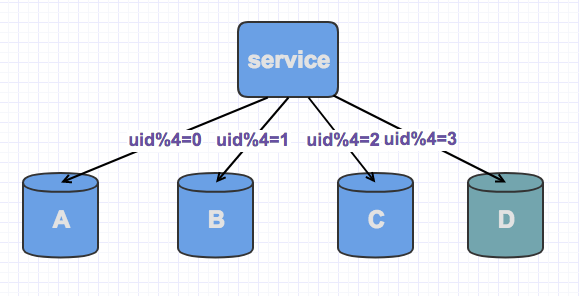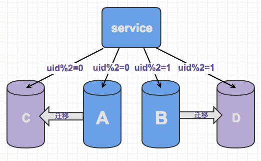 比如之前uid1通过uid1%3 分配在A库上,新加入库D之后,算法改为uid1%4 了,此时有可能就分配在B库上面了。如果你有看到之前《一致性哈希的原理与实践》,就会发现新增一个节点,大概会有90%的数据需要迁移,这个对DB同学的压力还是蛮大的,那么如何应对?