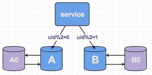 此时,当需要扩容的时候,我们把A0和B0升级为新的主库节点,如此由2个分库变为4个分库。同时在上层的分片配置,做好映射,规则如下: