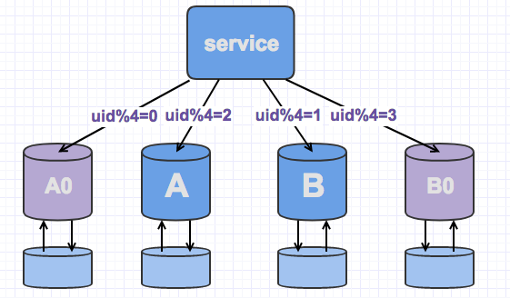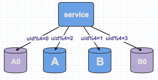 线上数据库,我们为了保持其高可用,一般都会每台主库配一台从库,读写在主库,然后主从同步到从库。如下,A,B是主库,A0和B0是从库。