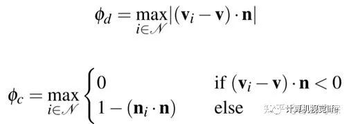 v应该是surfel模型中的v,对于每一个面尽量重叠,而重叠的方式则是让面间距离最小。因此该公式就比较直观了。