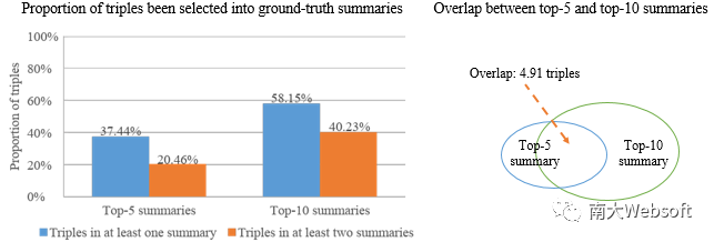 一个常被问到的问题是:top-5摘要是否一定是top-10摘要的子集?在标准答案的标注过程中,我们并没有对此做任何限制。我们分析ESBM的各类实体中,同一个用户构造的top-5和top-10摘要之间选入相同三元组的情况,结果平均有4.80-4.99的三元组同时出现在top-5和top-10摘要中。而在所有实体范围内,top-5和top-10摘要平均有4.91个三元组相同,非常接近top-5摘要容量为5的设定,说明top-5摘要很大程度上来源于top-10摘要的子集。