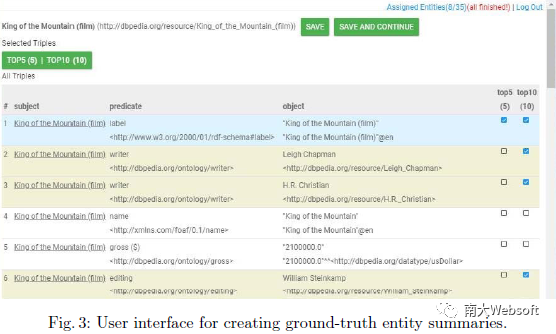 我们邀请了30位用户来对所选实体标注标准摘要。每个用户负责标注35个实体,而每个实体可以得到6个不同用户的标注。在每个标注任务中,用户需要对应两种不同容量限制(k=5,k=10)对实体各标注一个标准摘要,分别称为top-5摘要和top-10摘要。标注的方式,即从实体描述的所有三元组中,选出k个三元组来构成用户认为最佳的摘要。标注系统截图如下图所示。最终,我们得到175*6*2=2100个标准摘要。