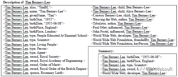 RDF数据以三元组形式描述实体相关的属性-值信息,我们将用于描述某个特定实体的三元组构成的集合称为该实体的实体描述。例如,在下图所示关于实体“Tim Berners-Lee”的实体描述中,三元组<Tim Berners Lee, alias, “TimBL”>描述了该实体的属性“alias”和值“TimBL”。