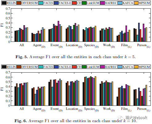 此外,我们还分析了现有摘要方法在不同类型实体上的表现,如下图所示。从中可以看出,在k=5时,BAFREC和MPSUM的效果在处理不同类型实体上具有较高的泛化能力,而在k=10时,MPSUM同样表现出相对较高的泛化能力。